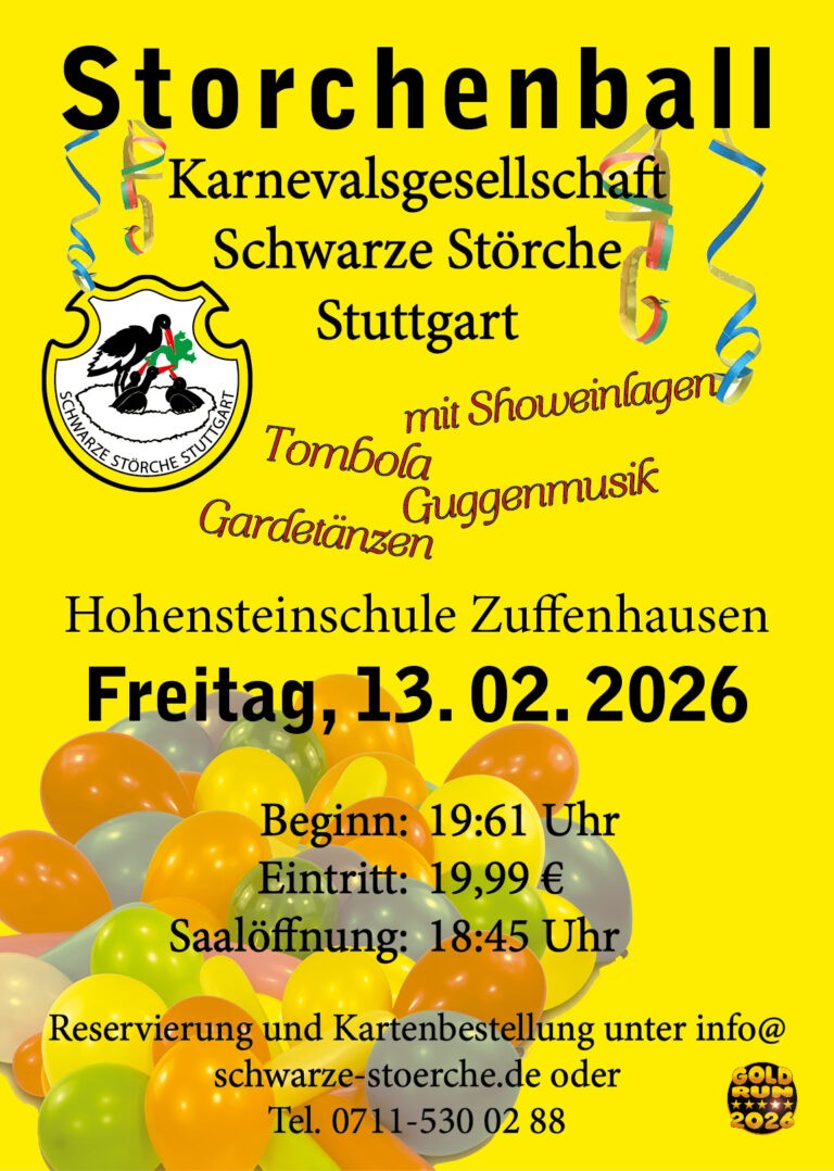 Wenn wir uns auf eines verlassen können, dann darauf, dass der Storchenball jedes Jahr zu einem unvergesslichen Erlebnis wird. Ganz besonders stolz sind wir darauf, dass wir jedes Jahr so viele andere Karnevalsgesellschaften aus der ganzen Region begrüßen dürfen. Wer einmal kommt, der kommt immer wieder und bringt gleich die ganze Familie mit. Es wird gesungen, gelacht und das ein oder andere Glas getrunken. Sei auch du dieses Jahr wieder mit dabei.